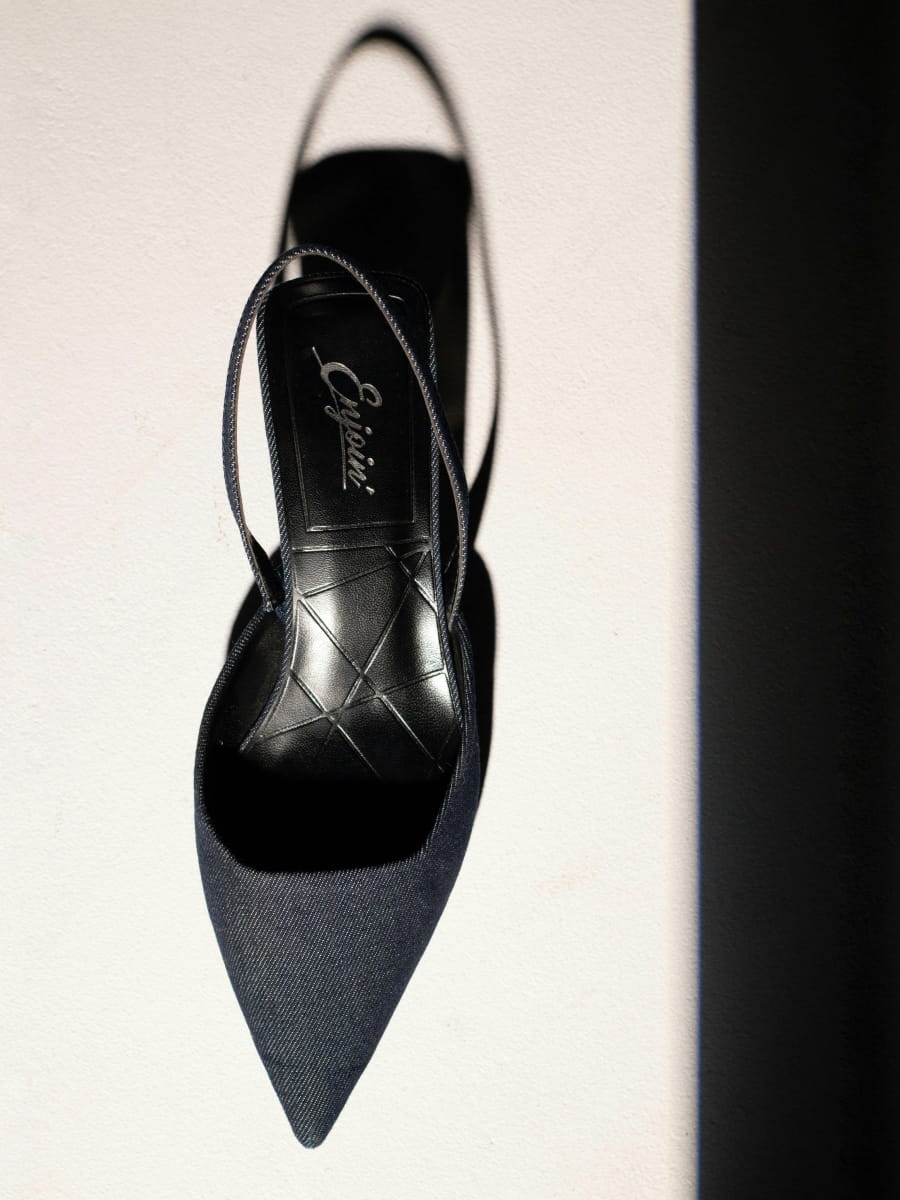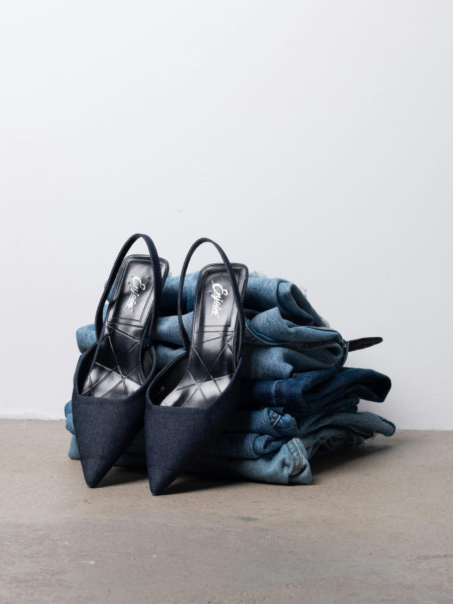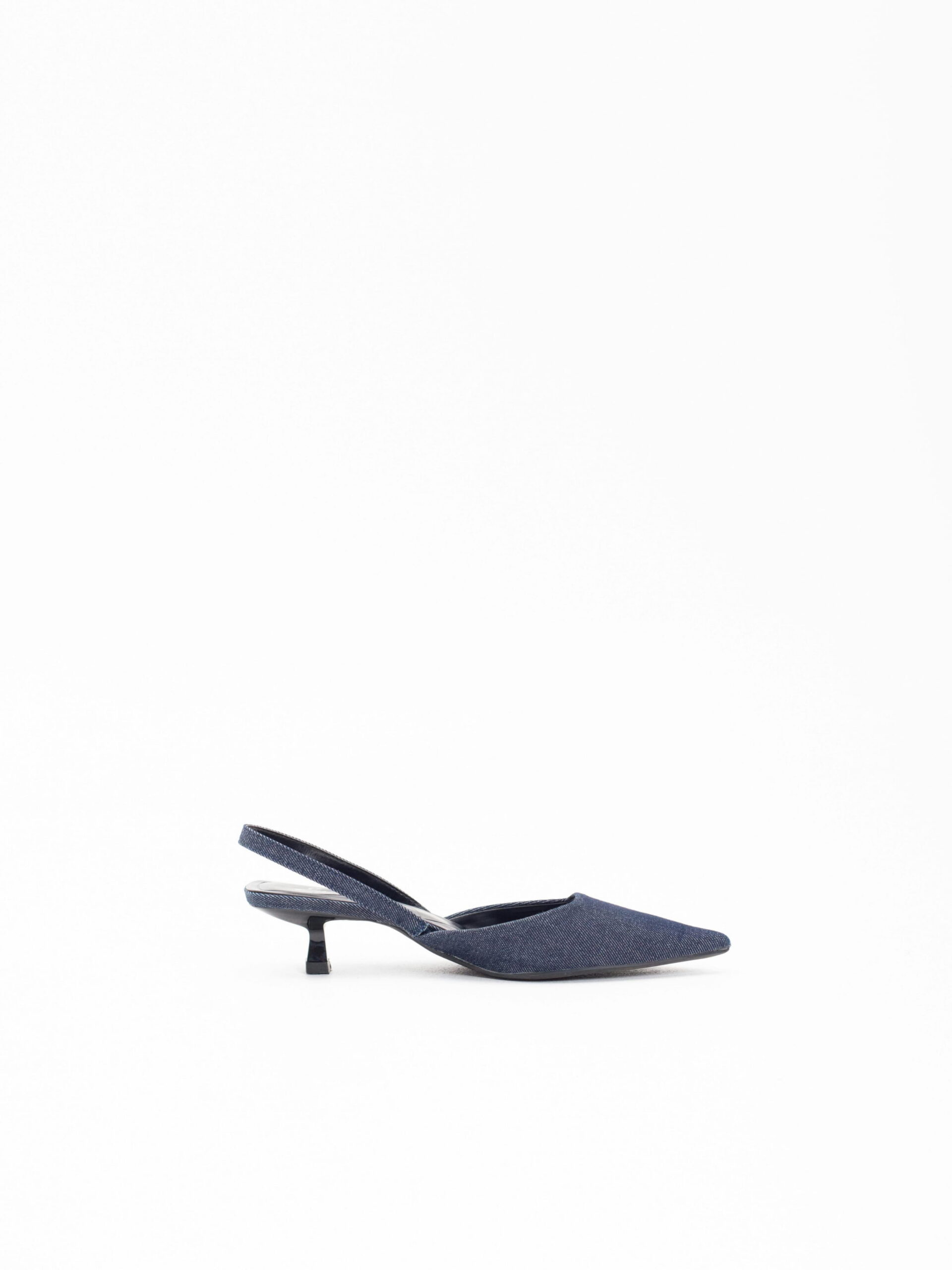 Jeans mule shoes. Thin mid heel. Round vamp. Pointed toe.