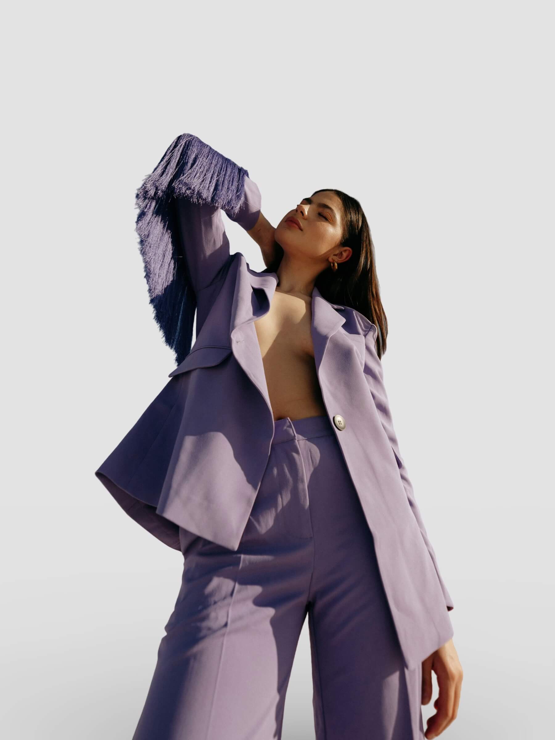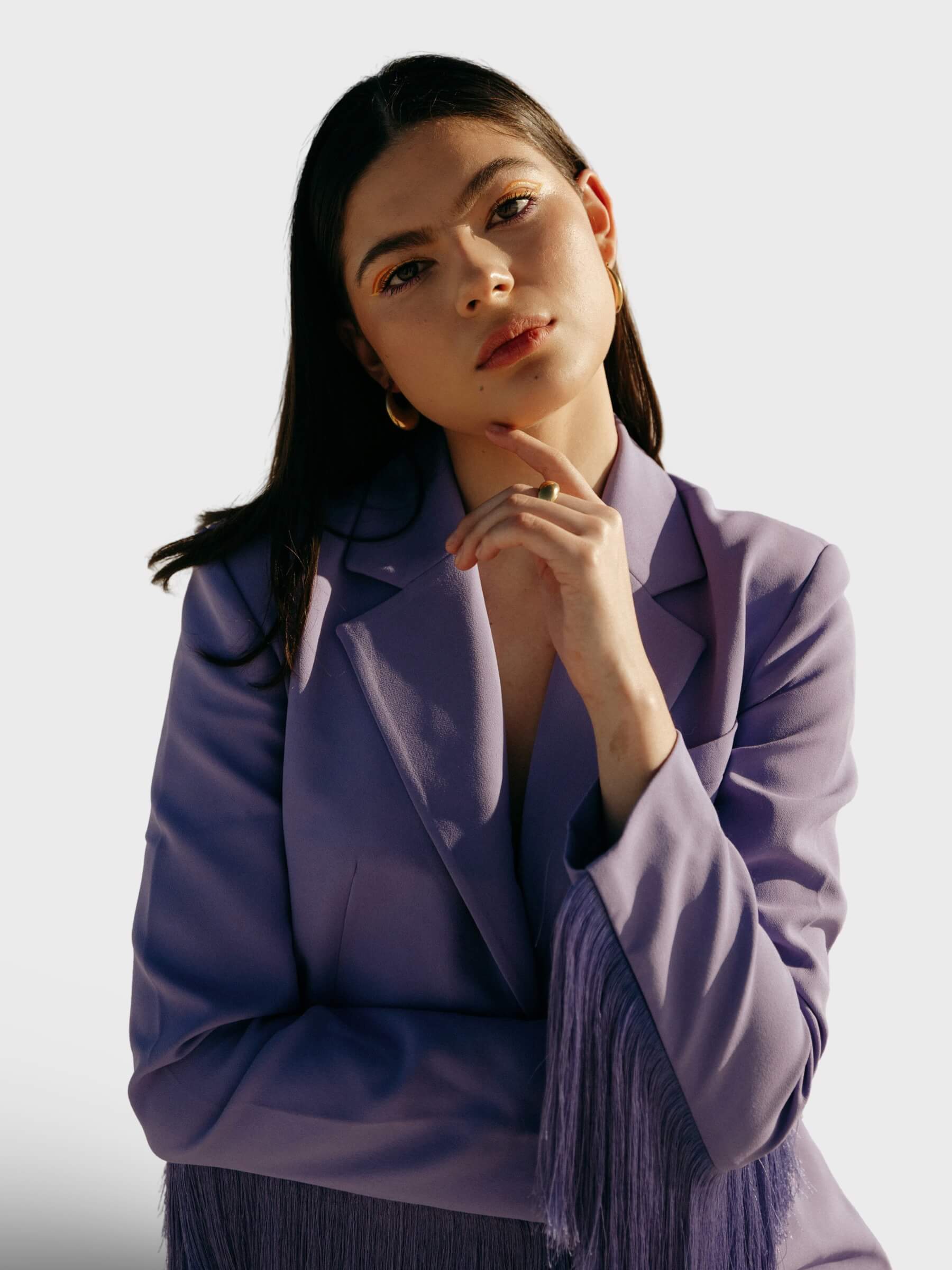 Jacket made of 100% wool. Long sleeves. Sleeves-fringe detail.
