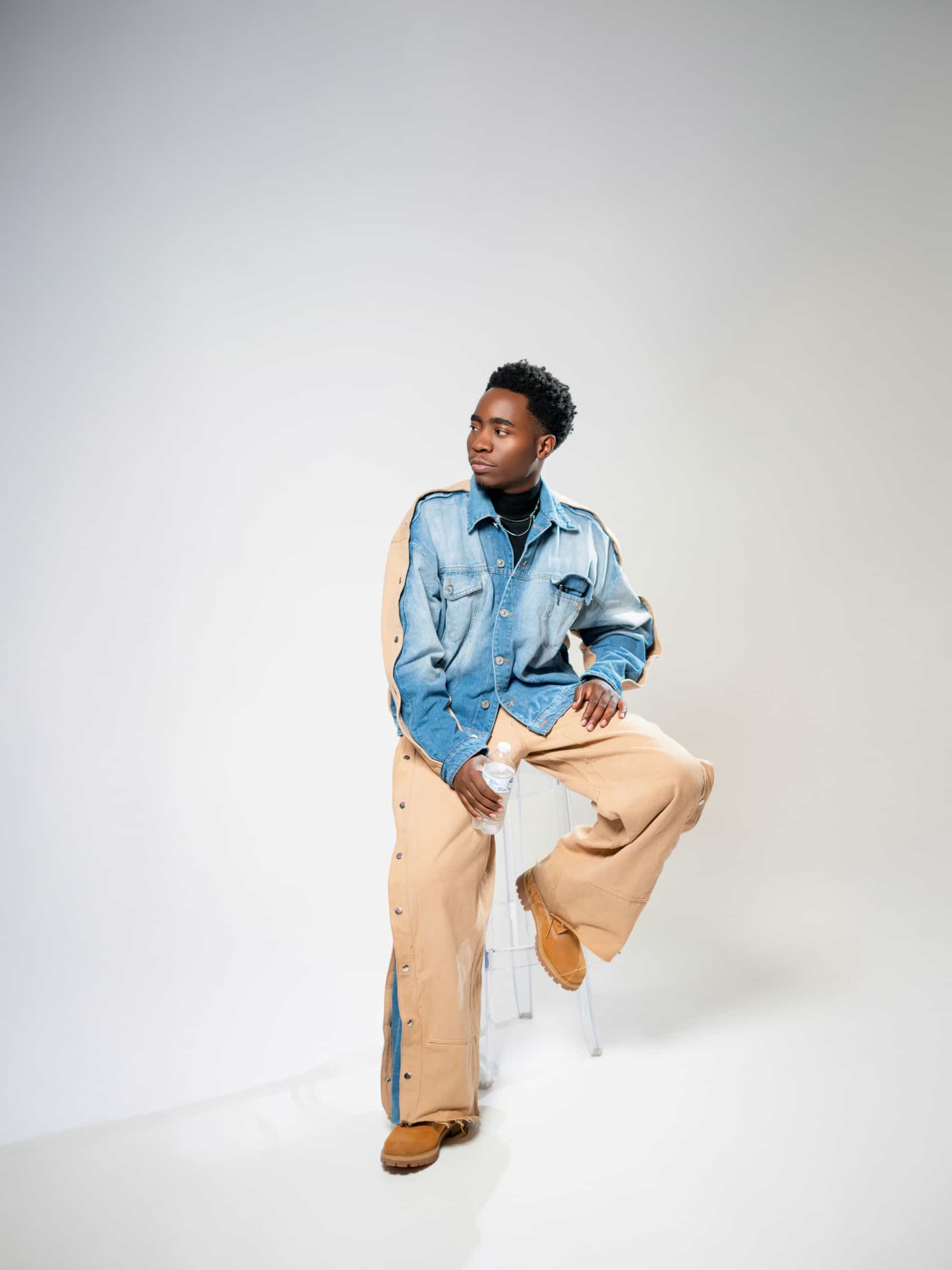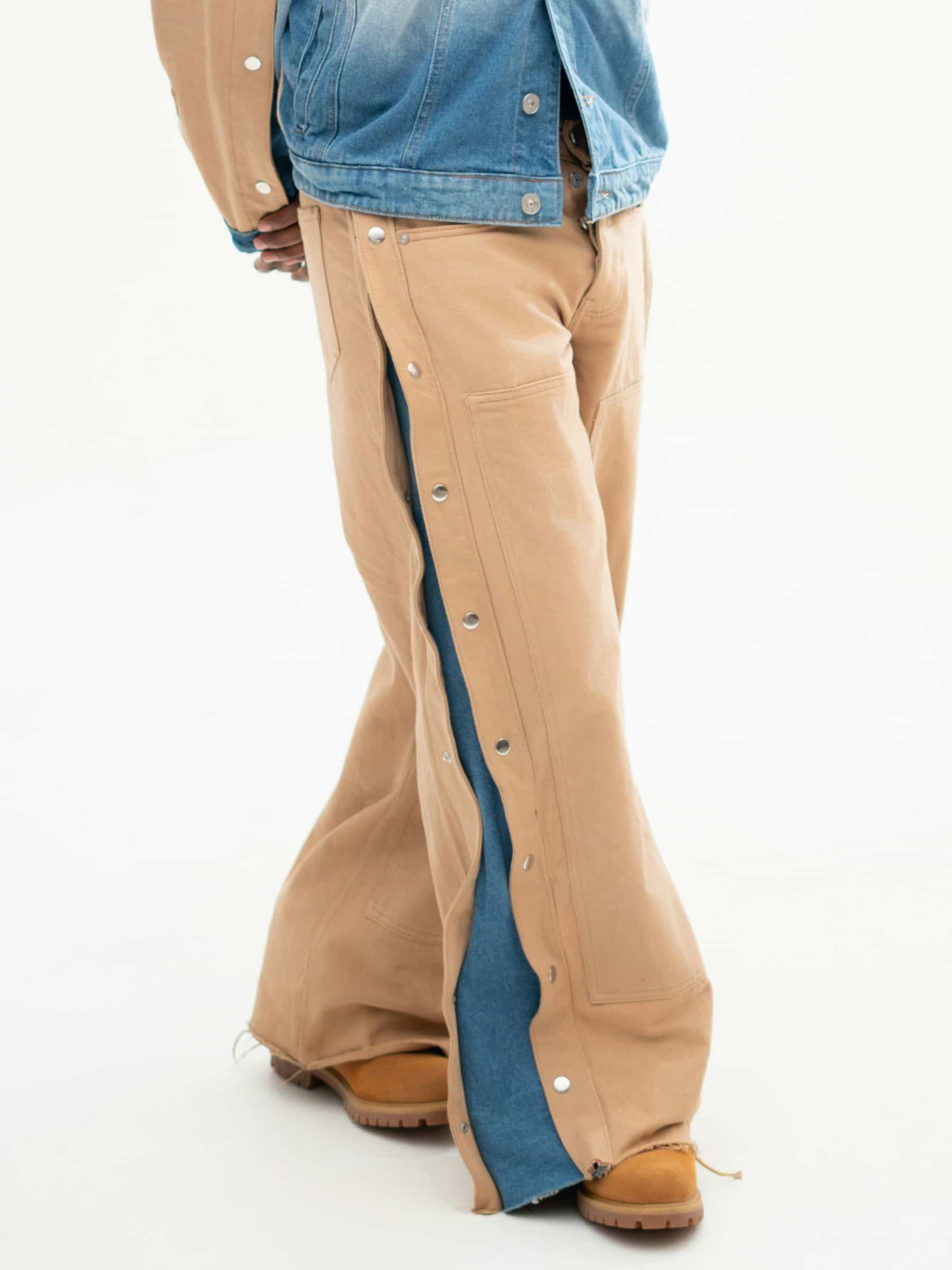 Wide denim pants with rivets on the side.
